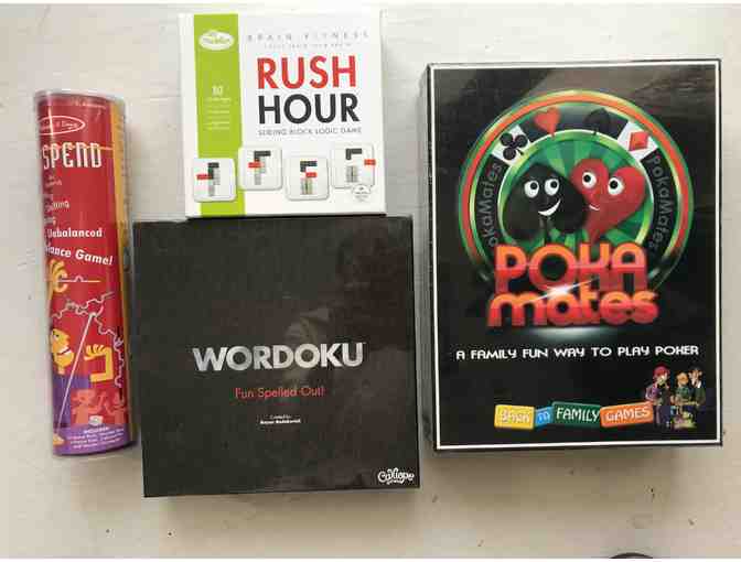 Game gift basket includes hours of family fun: Wordoku, Pokamates, Rush Hour & Susepend