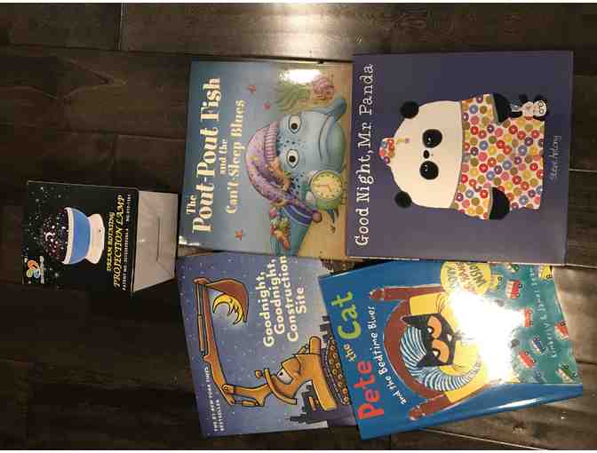 This crate includes (4) four hardback books and a night light moon star projector in a wooden crate to help with storing your bedtime books.