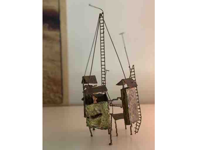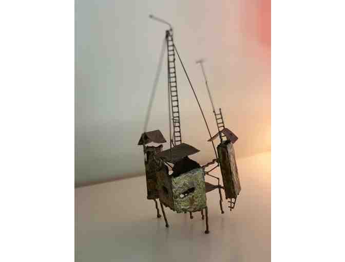 "Unique and unusual 1970s mid-century modern brutalist sculpture. Artist unknown, though it does look like it's signed on the inside of one of the 'houses.' Trust me though, I nor the 3 MCM art dealers I've dealt with can decipher it. It is definitely the era of Curtis Jere, though the artist will always be unknown. It's still so unique and fun! It is most likely brass AND copper - mixed metals."