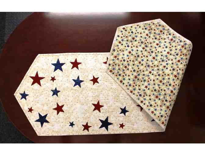 Your table will be the star of the show with this beautiful appliquéd table runner. Red, white and blue stars of various sizes are appliquéd on a cream-colored background with subtly printed stars and long, wavy quilting lines. The backing side is also cream fabric printed with tiny red and blue stars. At 16 x 50 inches, this runner would fit almost any table and bring a patriotic/festive touch to any decor.