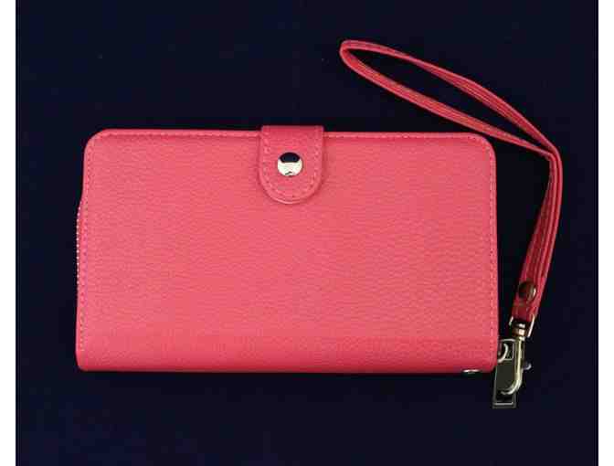 This compact, handy wristlet wallet stores an iPhone 6 Plus in one side with spaces for credit cards and ID opposite. The other side has a zipper which opens to a compartment for cash, receipts, and other misc. items. In bright hot pink, this wristlet is a brilliant alternative to heavy, cumbersome handbags.