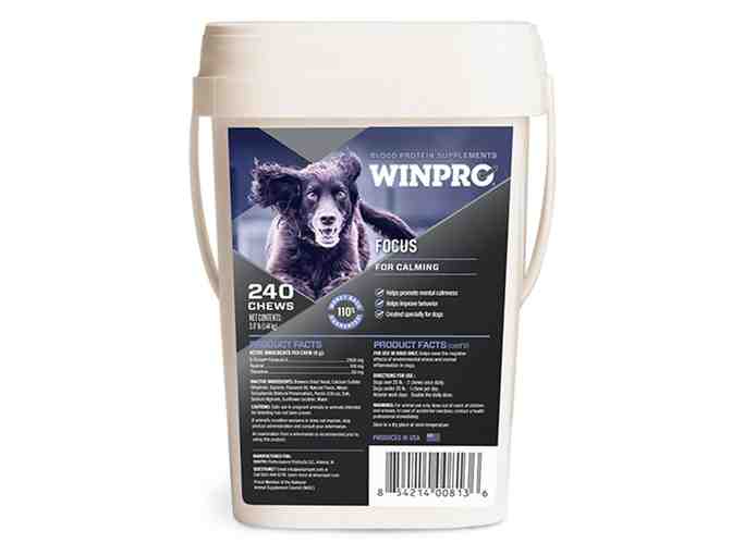 WINPRO Focus “contains a blend of animal blood proteins and other key ingredients to help reduce anxiety, improve mental calmness, and maintain mental alertness in dogs especially during times of noise, stress, travel, etc. This product promotes attentiveness without making your dog drowsy.” Pail of 240 chews.