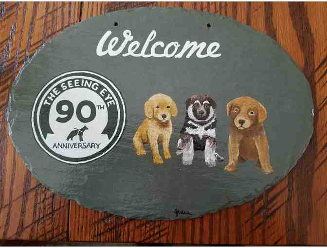 Slate Welcome Sign with Puppies and Seeing Eye 90th Anniversary Logo