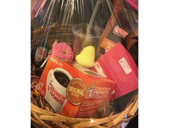Get your coffee fix with this Dunkin' gift basket. Basket includes: coffee mug, 16 oz Dunkin' tumbler, 12 count Keurig pods, 1 LB ground coffee, $25 gift card and a fun donut and Peep key chain!