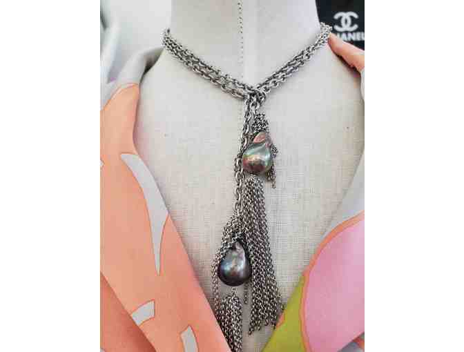 This beautiful necklace by artist Pattee Lebner can be worn as a lariat or like a scarf. The chain is silver enhanced by 2 large baroque peacock freshwater pearls. The attached fringe adds a bit of edge for the more adventurous girl.