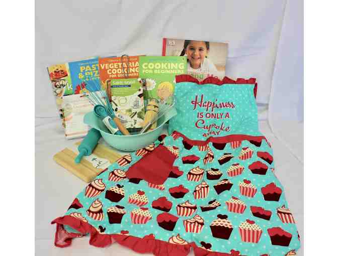 Includes: Apron, Strainer, Whisks, Measuring Spoons, Safety Grater, Small Bamboo Cutting Board, Small Rolling Pin, Chopper, Mom and Me Cookbook (Hardback), Taste of Home Kid Approved Cookbook, Pasta & Pizza for Beginners, Vegetarian Cooking for Beginners, and Cooking for Beginners.