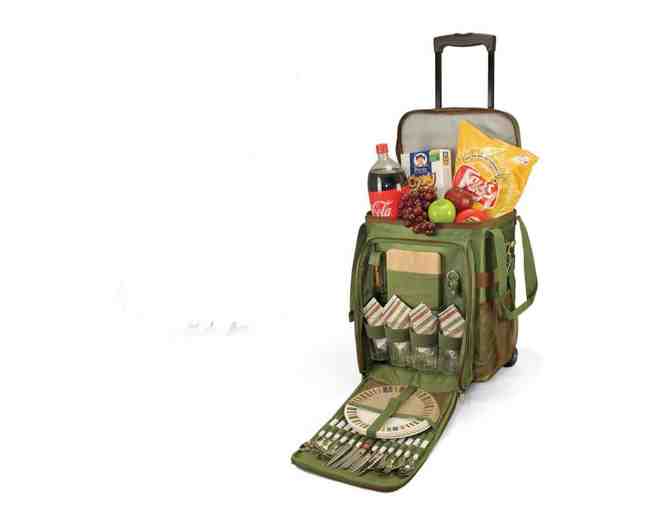 Picnic cooler on wheels with deluxe service for 4. Keep the picnic rolling with the Avalanche Picnic cooler on wheels! This unique and innovative design is another Picnic Time, Inc. original. Features deluxe service for 4, a huge 36 can-capacity food section with waterproof lining, and Thermoguard insulation. (4) 2" Easy glide (in-line style) wheels with telescoping handle makes no picnic spot out of reach.