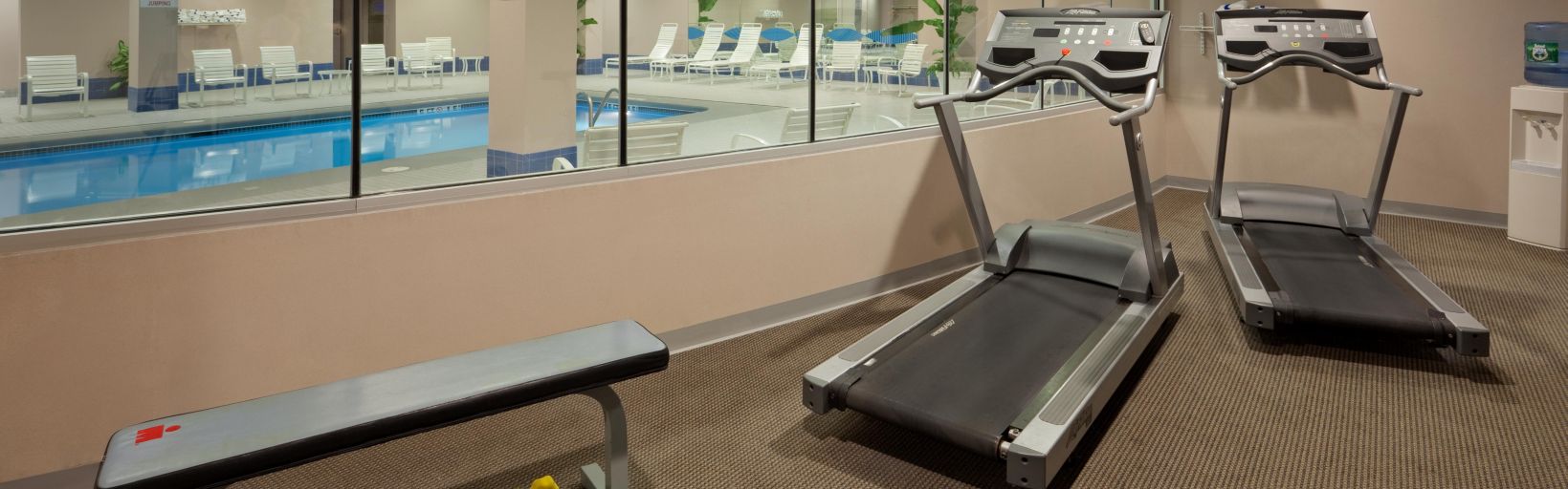 (Equipment included in the room includes 2 treadmills, 1 stationary bike, a weight machine, an Elliptical machine, free weights.)