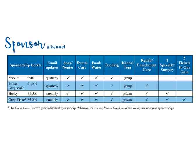 Yorkie and Italian Greyhound sponsorships may have up to two sponsors/kennel run. Husky and Great Dane sponsorships