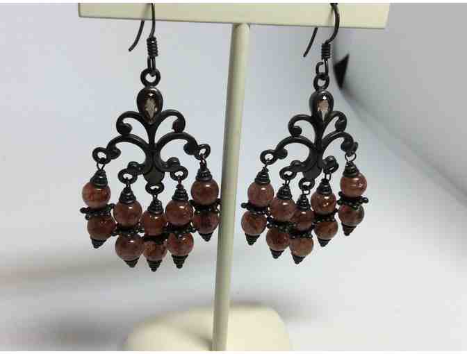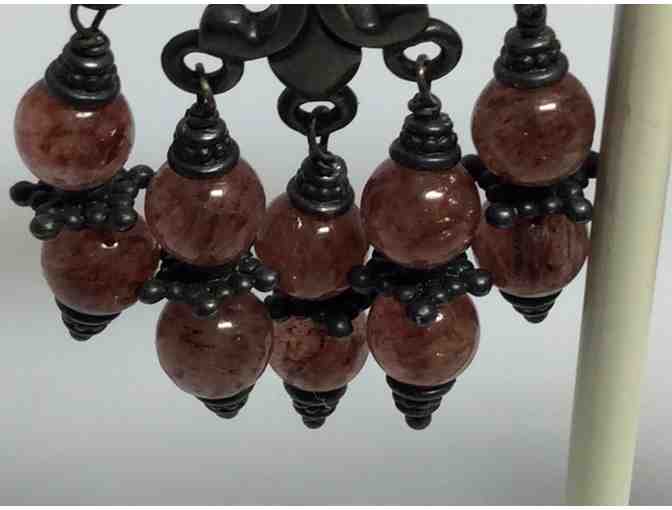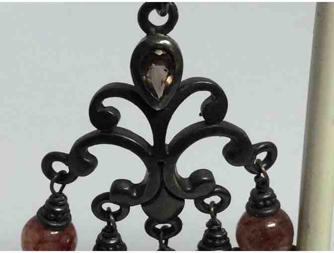 Handmade by Cleone Tucker Design these earrings feature a pear shaped topaz stone at the top center and components with natural red rutilated quartz rounds on oxidized sterling silver hooks.