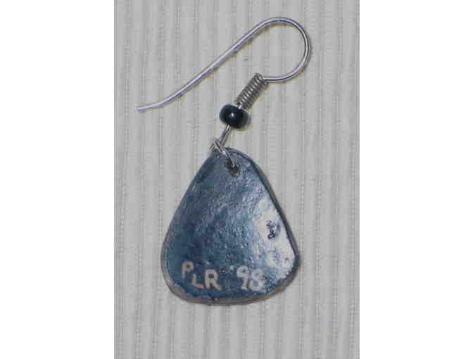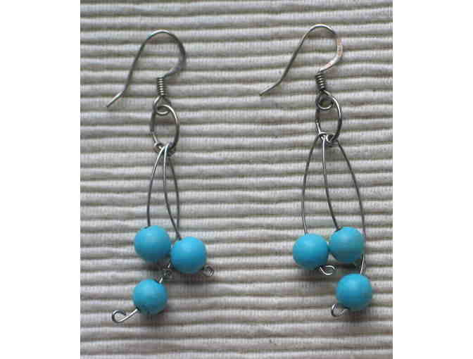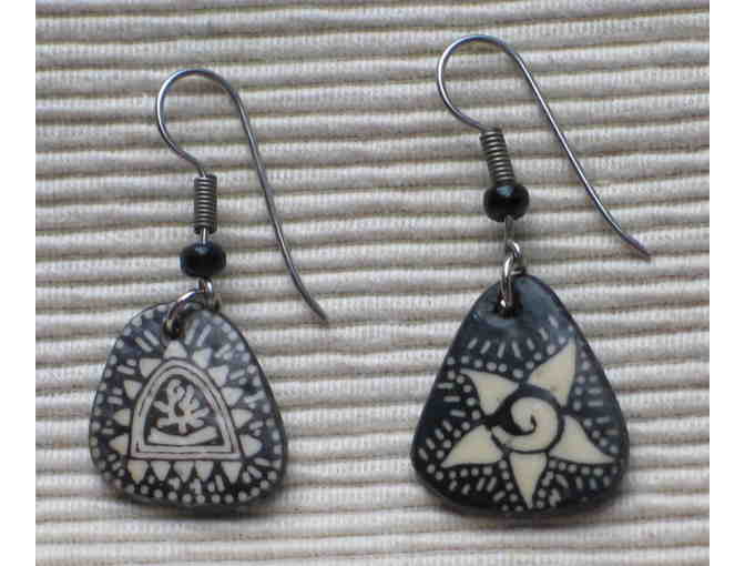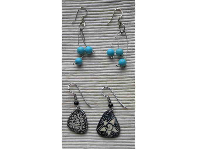 Pair of really cool, funky earrings--the blue bead earrings are 2" long including the hook; and the black and white earrings are 1 1/2" long, also including the hook. Both are artisan made.