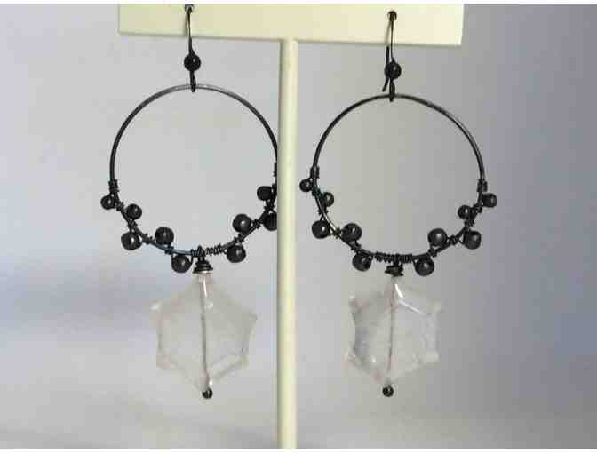 Handmade by Cleone Tucker Design these earrings feature oxidized Sterling Silver pierced ear hooks, beads and wire wrap. A Snowflake crystal dangle with inclusions hangs from its bottom. These earrings are 3 inches in length and 1 1/5 inches wide.