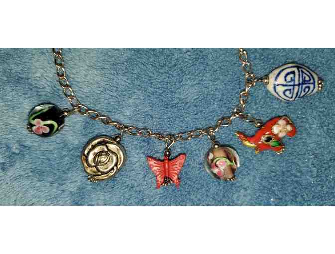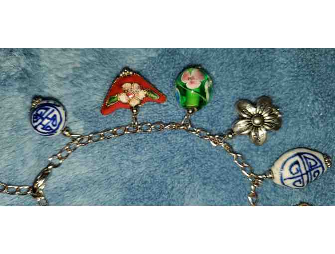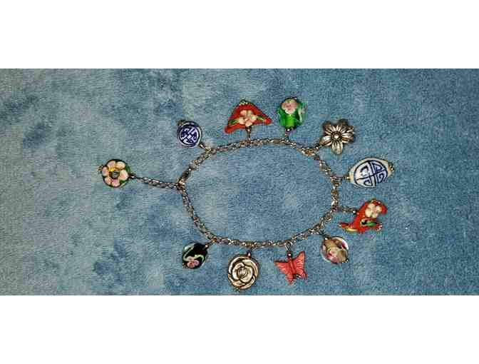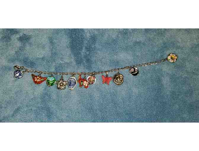 This sterling silver bracelet includes sterling, cloisonne, porcelain and stone charms. It is approx. 8.5" long and is adjustable. Makes a charming addition to any outfit! Pre-owned.