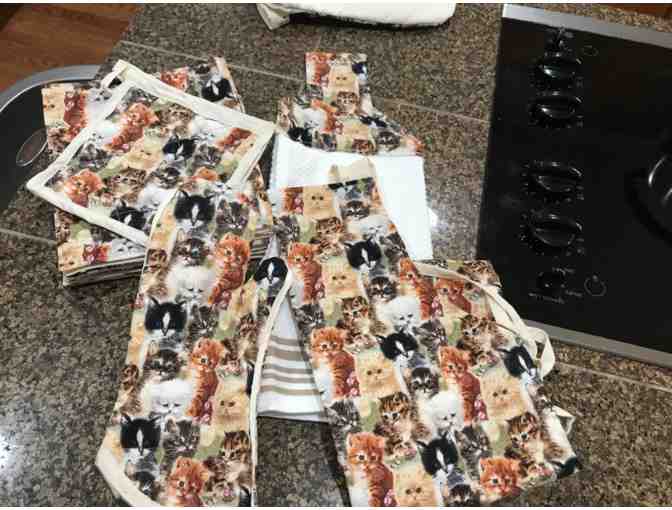 This set, handmade by NMDR volunteer Nona, consists of two pot holders, 4 quilted trivets, one hand towel that velcroes over a handle, one set of oven mits and one apron (one size fits most) This is an adorable and useful gift for all animal lovers!!