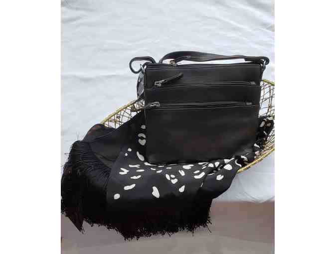 Travel in Style with this leather R & R travel purse with multiple zippered pockets and beautiful designer silk scarf.
