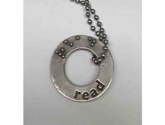 This solid sterling silver charm measures approximately 1 inch in diameter. The charm carries "Read" printed in text and braille on both sides. Comes with a 24 inch stainless bead chain.