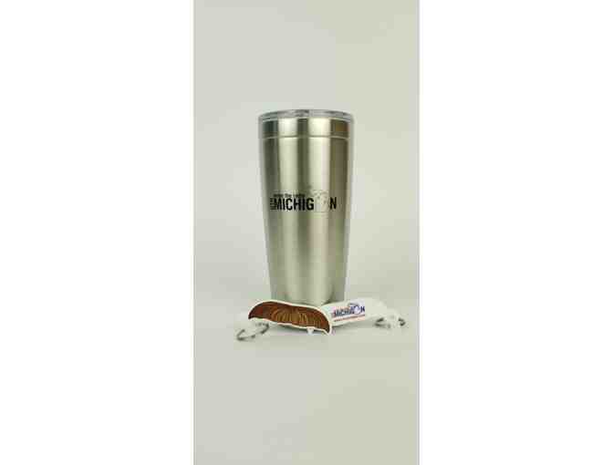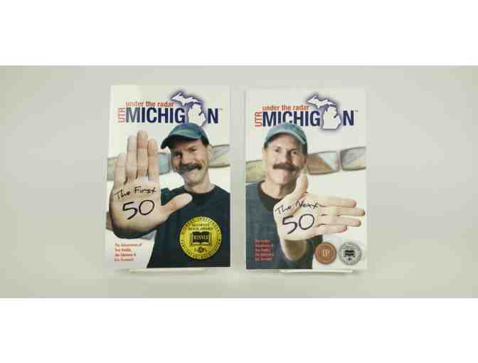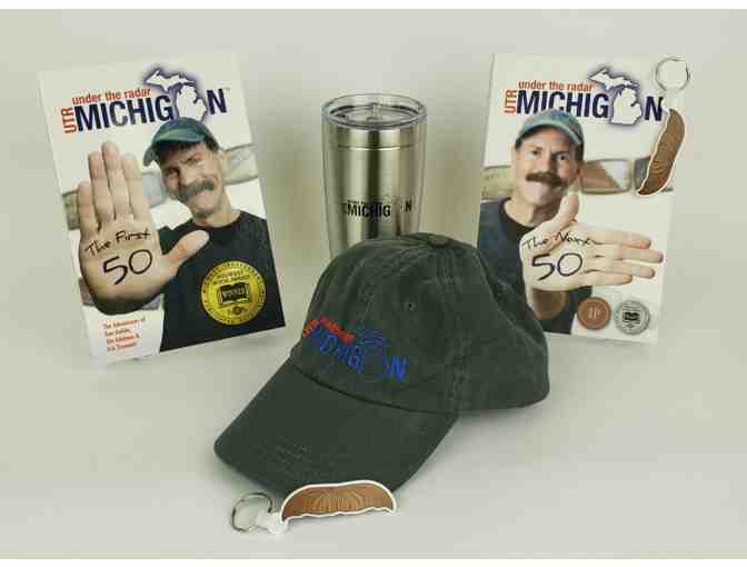 This gift set includes: Two books, "Under The Radar Michigan: The First 50" and "Under The Radar Michigan: The Next 50", a UTR silver insulated to-go coffee mug, a UTR baseball hat, and two UTR keychains featuring a replica of Tom Daldin's (TV host) mustache.