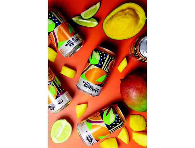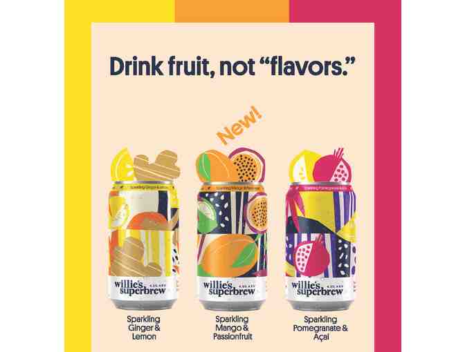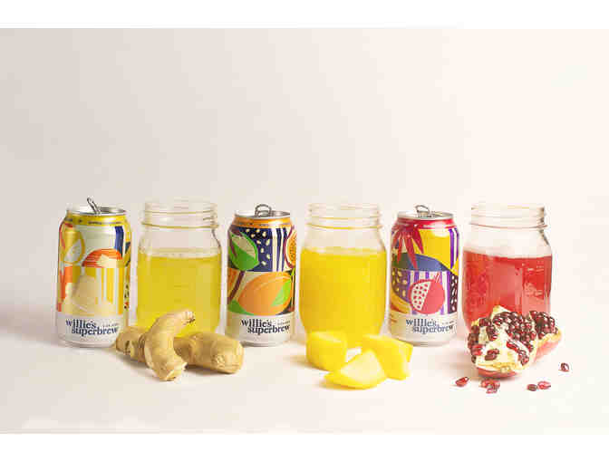 4 - 6 packs of Willie's Superbrew Hard Seltzer made with real fruit in the following flavors: Sparkling Ginger & Lemon; Sparlking Mango & Passion Fruit; Sparkling Pear & Cinnamon and Sparkling Pomegranate & Acai.