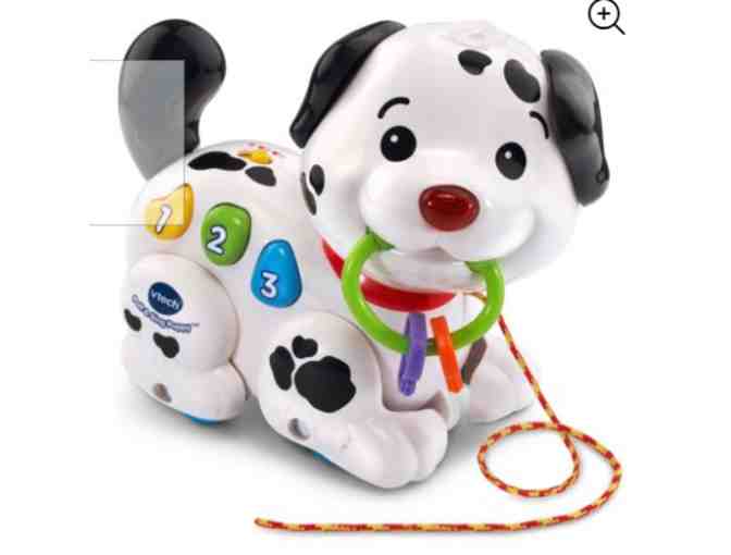 Get ready for fun and adventures with the Pull & Sing Puppy by VTech. This playful interactive puppy loves to follow you around. Pull the puppy by its cord to activate music and sounds, see the puppy's legs move and watch the keys swing. Press the colorful buttons to introduce numbers, colors and parts of the body. The buttons also play songs, playful phrases, melodies and cute puppy sounds. The puppy's nose flashes along with the sounds and music plays when the puppy rolls.