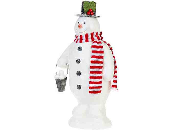 Add a touch of Christmas charm to your home this season with this fun home accent. Cozy snowman figurine with red and white striped hat, bucket of snowballs, and top hat. Measures approximately 11.5 inches. Spot clean only. Made of a durable paper material. Perfect atop a shelf or nestled on a mantel