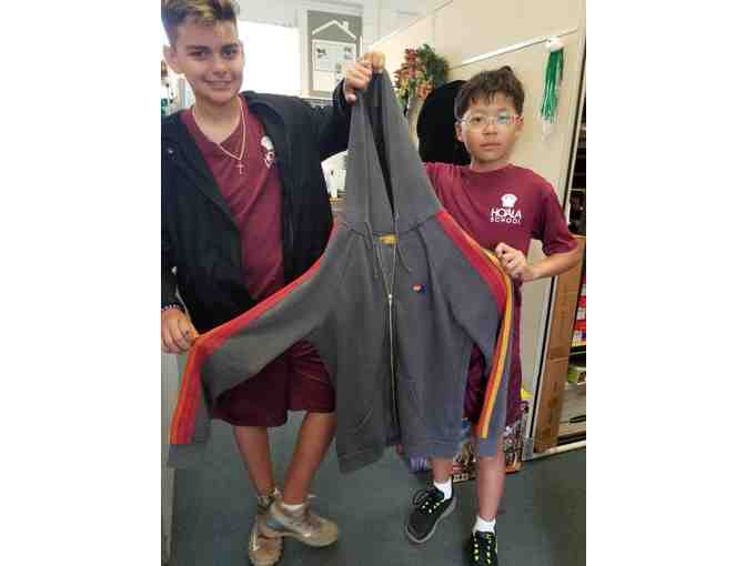 This Aviator Nation Zippered Hoodie, Size Adult Large, is incredibly soft! The jacket is gray with multi-colored stripes down the sleeves. It's lightweight and perfect for cool Hawaiian winter evenings!