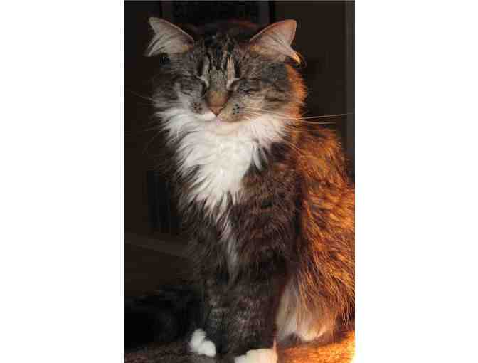 Meet Helen-she was rescued as a small kitten in a wooded area before she was where coyotes were roaming. She was taken to a vet for a medical evaluation before going into foster care. Upon examination by the vet, it was determined that Helen was blind..........she was born without eyes. She was adopted by her rescuer, one of our volunteers (a nurse) who has lots of experience with handicapped animals.