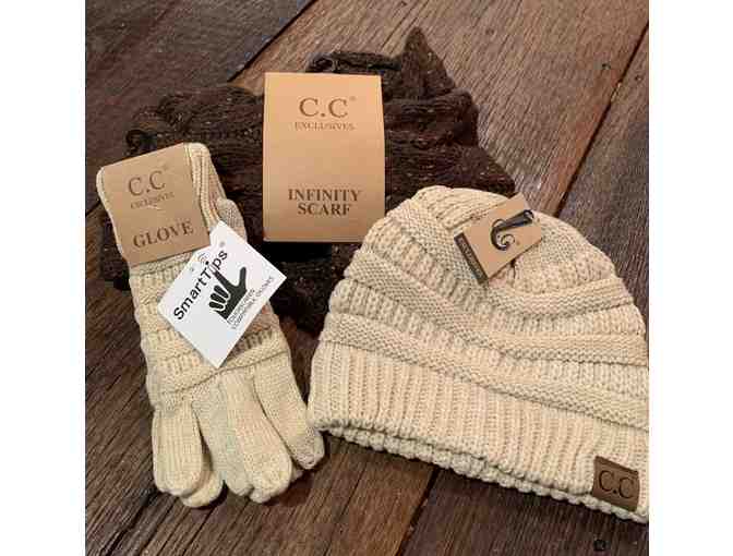 Beige C.C Exclusives Hat and Gloves. Brown C.C Exclusives Infinity Scarf.