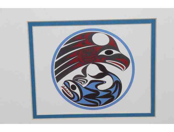 Unsigned print: Eagle and Salmon. Framed size 13.5” x 11". Image size 6.5” x 5.25”.
