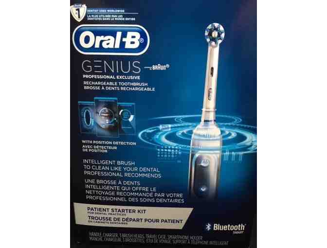 This Oral-B Genius Rechargeable electric toothbrush has 3 brush heads, travel case and smartphone holder.