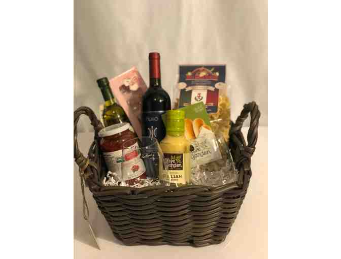 This basket is filled with everything needed to enjoy an Italian Dinner at home beginning with a bottle of Primitivo Salento Red Wine and 2 stemless wine glasses. Basket also includes Pasta, Tomatoe/Basil Sauce, Olive Oil Bread Dipping, Olive Garden Salad Dressing and a $25 Olive Garden Gift Card.