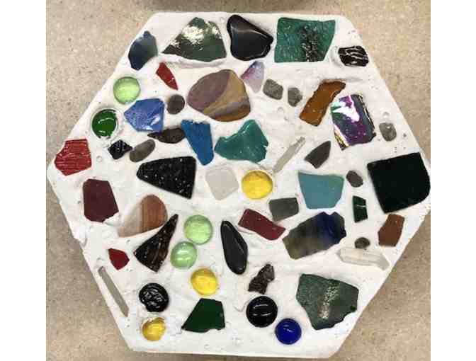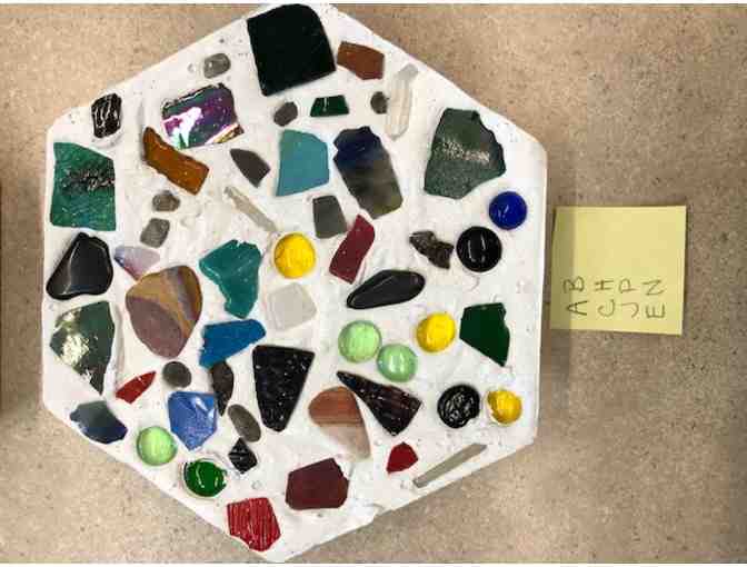Brighten your path with a beautiful hexagonal stepping stone created with 1st grade students AB, CH, JP, EN. Decorated with colorful glass pieces.