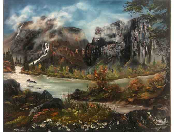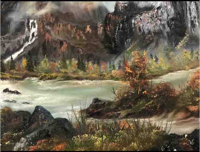 Do you love landscape paintings? This 16" x 20" oil on canvas painting portrays the beauty and strength of the mountains, waterfall and river on one canvas. Painted by local artist, Marianne Hester.