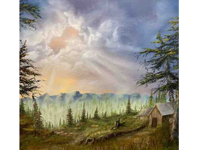 This beautiful 12" x 16" painting is ready to grace a wall at your home. The light pouring through the clouds gives warmth to the landscape. Painted by local artist, Marianne Hester.