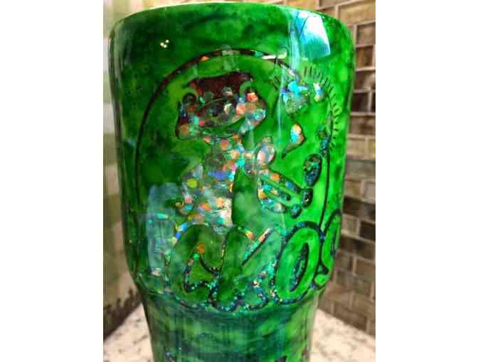 Show off your school spirit with this awesome one of a kind handmade cup. This 32oz tumbler cup includes a lid, 2 straws and holds hot or cold liquids. It's made with non - toxic glitter, food grade epoxy, and alcohol ink. Handwash only. Treat like glass, if dropped it will break!
