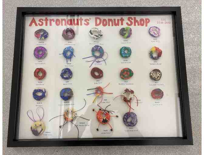 Each donut was carefully handcrafted by each student in the Astronaut Class. The class was interested in investigating baked goods for our Project Approach, which lasted a whole year! Each Astronaut creatively drew out their donut design and came up with a name for their donut. Then, our Astronauts got "down and dirty" when constructing their donut together by using modeling clay, paint(s) to add colorful details, and glue to add fun accessories such as googly eyes and lanyard strings for hair.