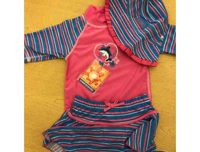 - Includes: sun hat, swim skort, rash guard and keychain