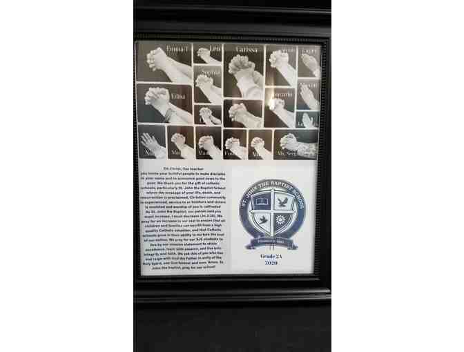 This one of a kind artwork incorporates each student's praying hands and names in Grade 2A with an original prayer written by SJS's Fr. Kevin Leaver. Package includes two pieces, each framed in black. Sepia toned piece measures 8.5" x 11", Natural toned piece measures 17.5" x 14" and is ready for hanging.