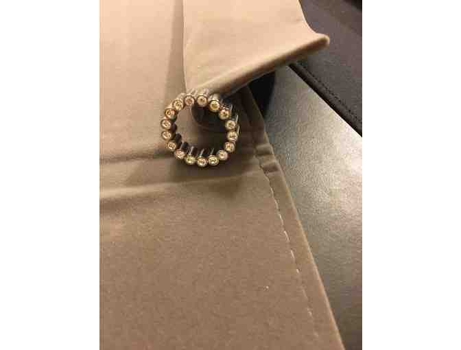 This solid sterling silver ring is studded with 17 genuine brilliant cut Swarovski crystals on each side (for a total of 34 crystals), adding some rock and roll to your daily routine! Its rounded edges make it very comfortable to wear and measures 6.75 to size 7 in finger size. Comes in its own velvet pouch, new and unworn, perfect for safekeeping or gift giving.