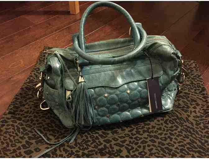 The one and only MAB mini, from Rebecca Minkoff, is just the right size to hold your necessities and then some for daily wear. This slouchy satchel is a special edition turquoise quilted version, and the supple leather circles are further accented by silver studs. It comes with Rebecca's signature tassels (removable if you prefer) and has a full size zipped pocket in the front and two phone sized pockets on the corners. It can be worn on the hand or you can clip on the leather strap for shoulder/crossbody wear. Comes with her signature leopard printed dust bag, new with tags, for safekeeping or gift giving.