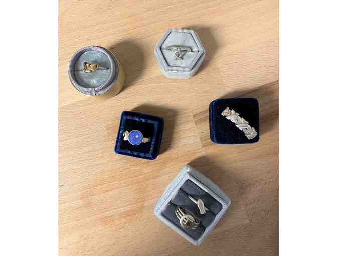 Bid on these one-of-a-kind sterling silver rings (size 6), all six rings made by the Parisian brand Clio Blue. Each ring has the ichthys or ichthus symbol, to resemble the profile of a fish. Many of the designs move by spinning or gliding.