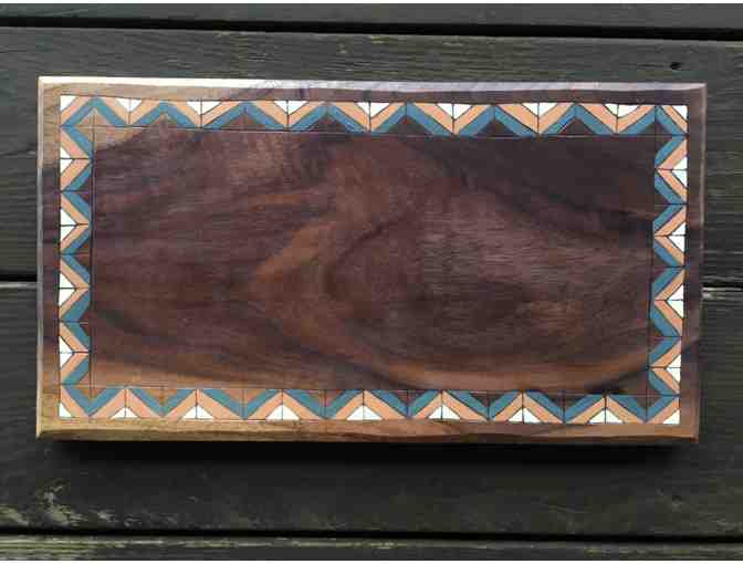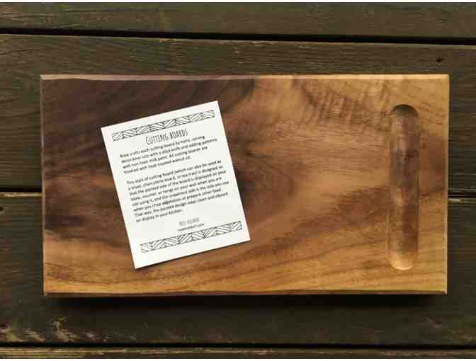 Cutting board made from walnut wood, hand carved decoration finished with milkpaint and Tung Oil. Measures 14" x 7.5"