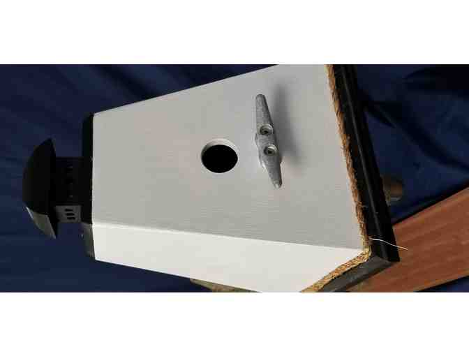 This birdhouse is modeled after the Beverly lighthouse. It comes ready to be mounted to a tree, or can be modified to be mounted to a fence post or garage. Hand crafted by Keith Bachman.