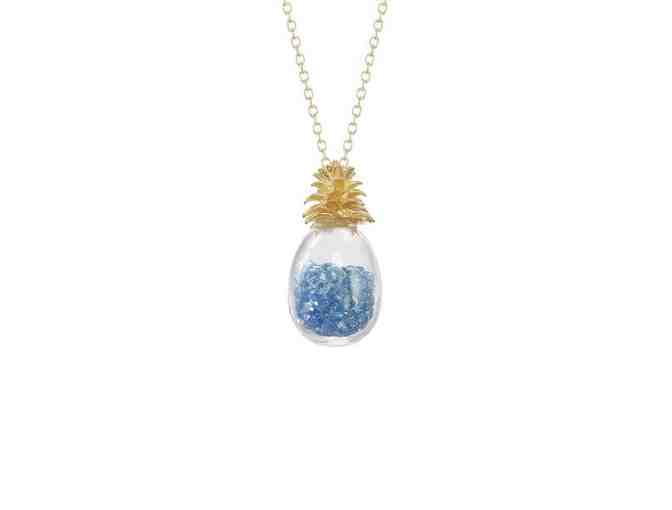 Alive with vibrant color and dynamic movement, this tiny pineapple has big personality. A must-have for a trip to the islands or for elevating an everyday outfit to an eye-catching ensemble. Choose from a varied palette of free-floating colored crystals or light blue. The hollow glass chamber is vertically held by a delicate piece of organically styled 18K gold vermeil.