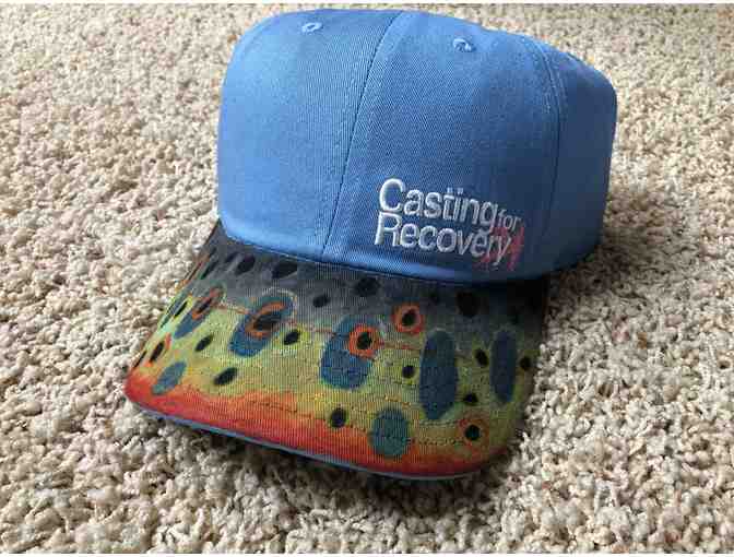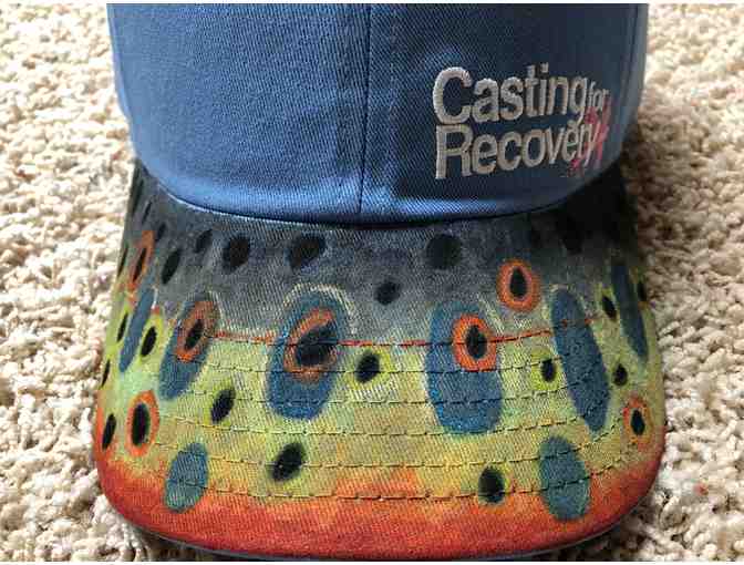 Here's an amazing and fun Casting for Recovery hat that has now been made into a piece of art! It's hand painted by Jodi Monahan of Missoula, MT whose artistic talents are unending. You'll be the only one who has one so get ready for others to want it! Jodi has painted the bill of one of our CfR blue ball caps with the colors and spots of a brown trout.