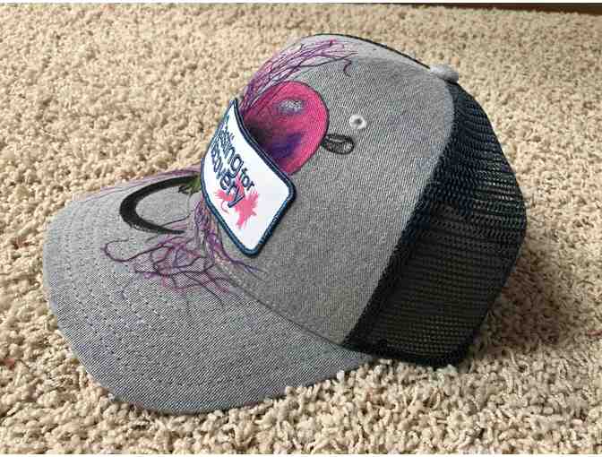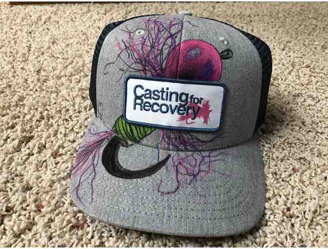 Here's an amazingly fun Casting for Recovery hat that has now been made into a piece of art! It's hand painted by Jodi Monahan of Missoula, MT whose artistic talents are unending. You'll be the only one who has one so get ready for others to want it! Jodi has painted one of our gray CfR trucker hats with a colorful nymph in her signature style.