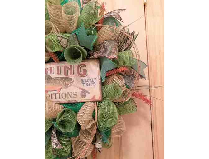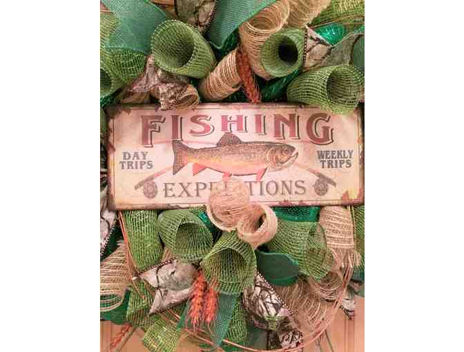 Fishing Wreath - Wreath made with deco and Burlap mesh. Embellished with greenery and metal fishing sign. Measures 22" x 22". Shipping weight is 3 lbs