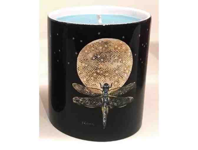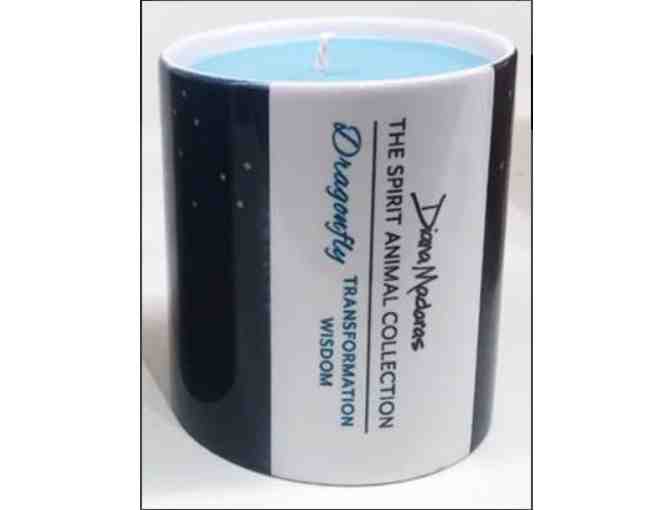 The "Fly Away" candle features a Dragonfly known for its traits of Transformation and Wisdom. Scent is Summer Breeze.