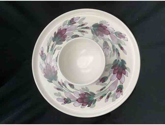 Measures 11 inches across. Dip bowl is attached.