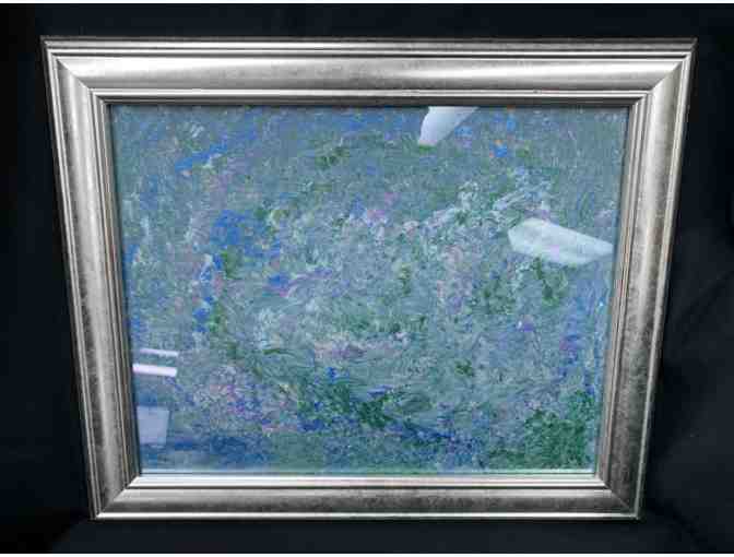 "Floral Waterland" is a framed acrylic. Measures 14" x 17"