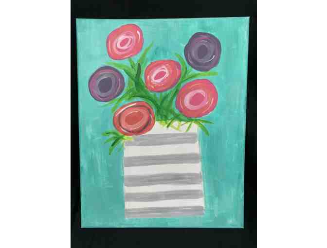 Bright Florals in Gray Striped Vase - acrylic painting by local artist Kamryn
